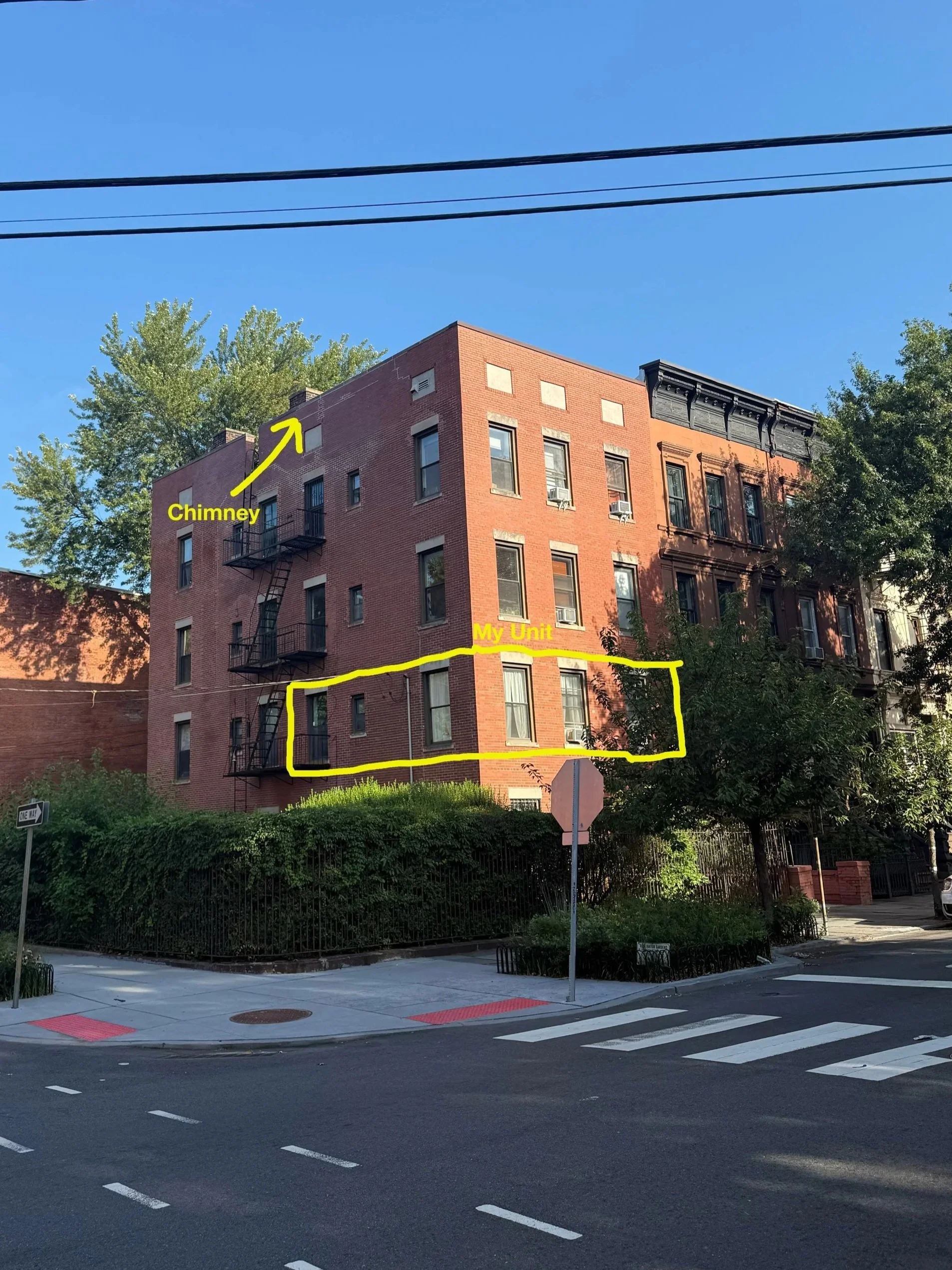 The building is 4 stories tall and contains a basement and a roof. The roof is accessible by the staircase and has a deck on top. Each story is approx 11 feet tall. The chimney I was told was originally built to vent a boiler that no longer exists. My unit is on the 2nd floor facing the front of the building. It’s in a historic district and I was told if I run AC lines on the outside of the building the city would make me remove them. So it appears going through this chimney is the only option. The chimney has a cast iron access door in the basement. It’s full of electrical cable feeding the apartments.